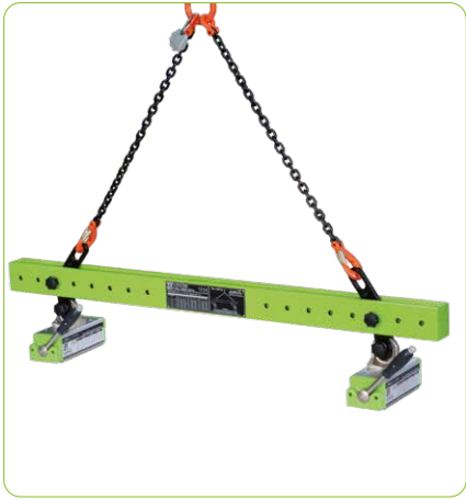 FX-LT Magnetic beams are adapted to the needs of the sheet metal fabricators, laser and flame cutters. Two FX-VV permanent lifting magnets and a lightweight beam enable loading and unloading of machines with sheet metal, or horizontal pick up of workpieces with a central cut out. In a few simple steps, the magnets can be removed from the beam to lift blanks and small sheets with only one magnet.